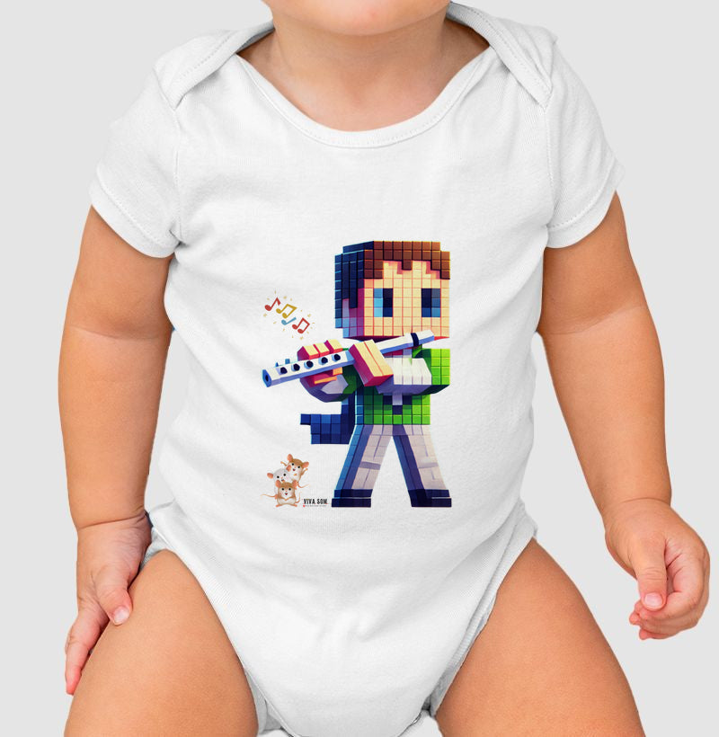 Este body é para o bebê que já imagina um mundo de blocos e música! Com o flautista no estilo Pixel, o pequeno vai viver aventuras sonoras e visuais cheias de criatividade. Música e diversão em cada movimento! 🌟🎵🪄