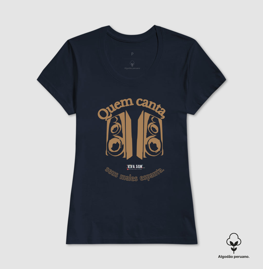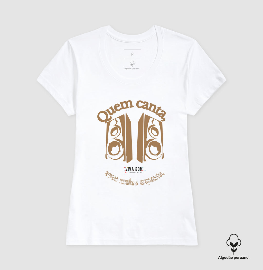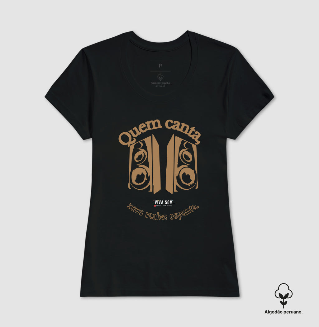 Caixas de Som “Quem Canta, Seus Males Espanta” - Camiseta Algodão Peruano Clássica e Baby Look